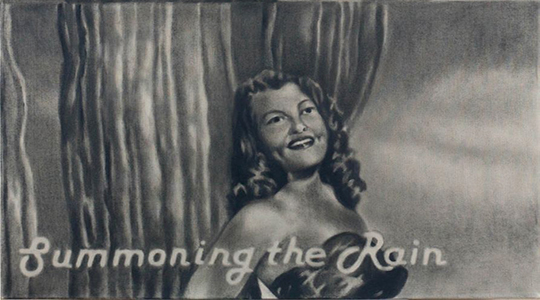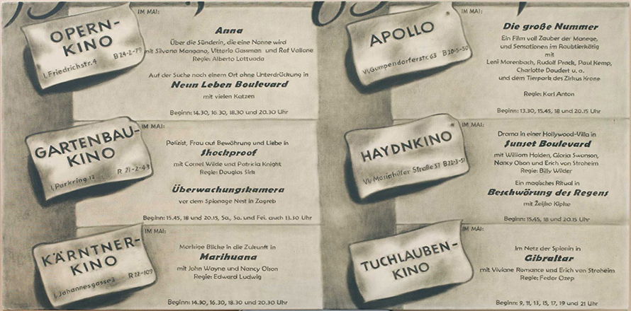 The works were made on the basis of photographs found in the 1950s magazine Wiener Film Revue. The first painting is a frame from the film Gibraltar, in which Erich von Stroheim almost strangles Viviane Romance, aroused by her laughter. This scene is accompanied by a caption which, in the artist’s intention, justifies the brutal gesture.