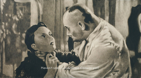 The second painting was inspired by an article about the state of the two actors Cornel Wilde and Patricia Knight in Vienna. In both canvases the artist draws on his own film Surveillance Camera, which deals with the individualisation of the life of an ordinary person by a city’s CCTV cameras.