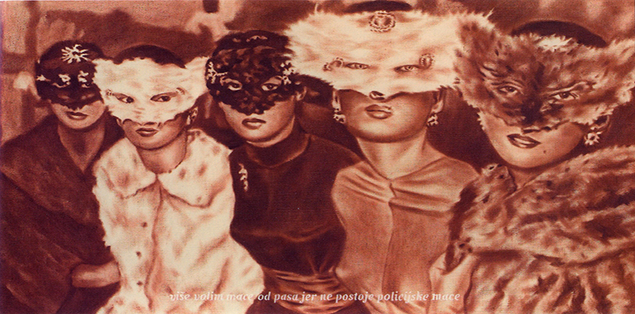 I prefer cats to dogs because there are no police cats, a book character remarked (Ramon Diaz Eterovic Simeon: Los siete hios de Simenon). Based on this comment a painting of Parisian women wearing cat masks originated (a photograph published in teh Vienese edition od Der Stern in 1956). It was followed by a canvas which, apart from the masked young women, contained the above comment and opened up a path for a film The Small Kitten and the Lion.